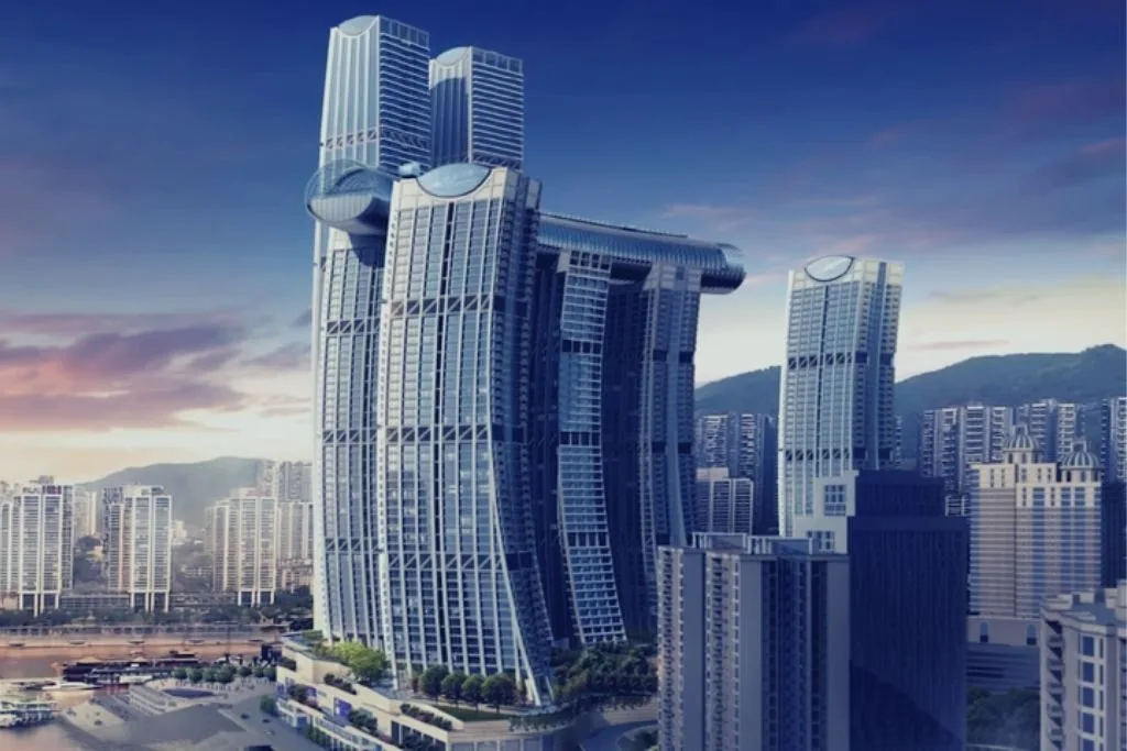 De manière similaire à l’emblématique Marina Bay Sands de Singapour, le gratte-ciel horizontal de Chongqing a quatre de ses tours qui soutiennent la structure par un pont de 250 mètres de long, appelé Crystal. Le soir, Crystal devient un faisceau de lumière qui souligne la forme horizontale.